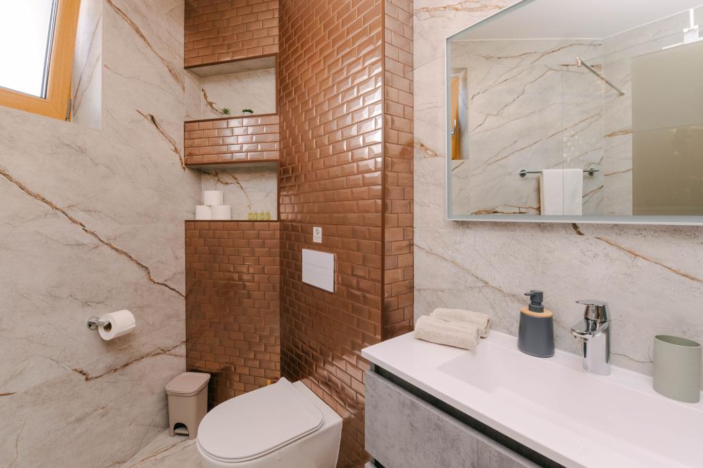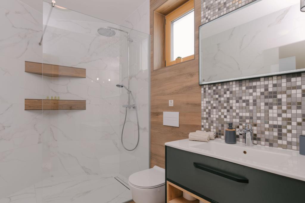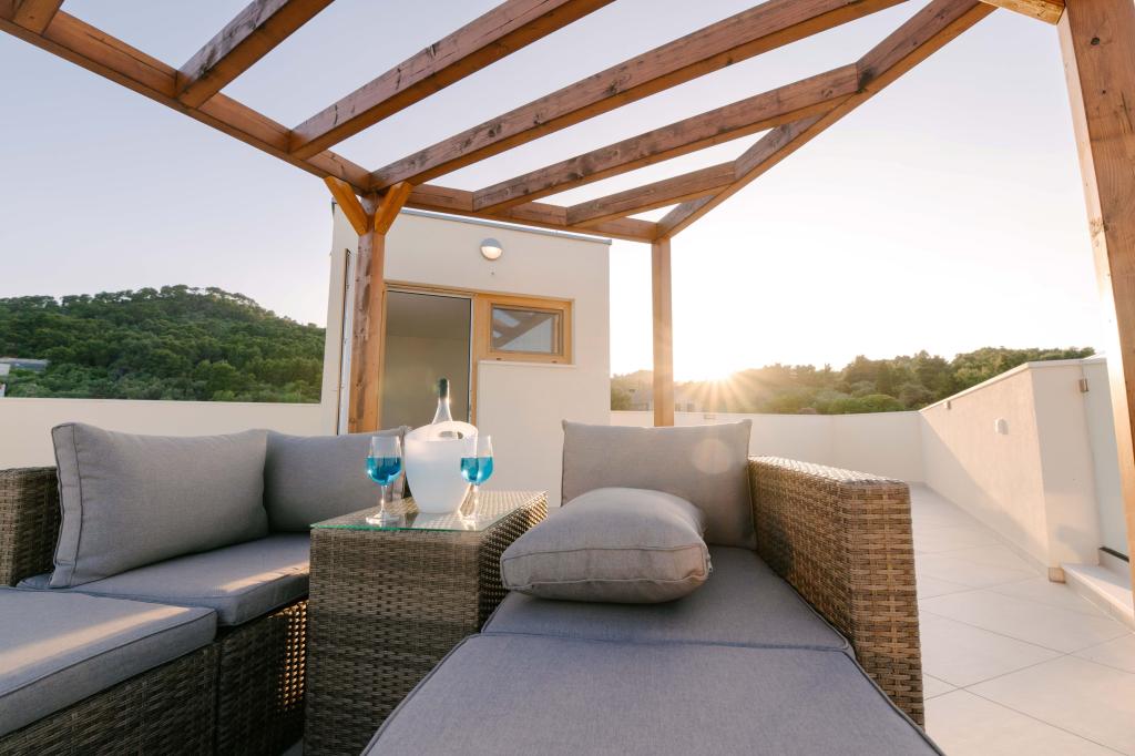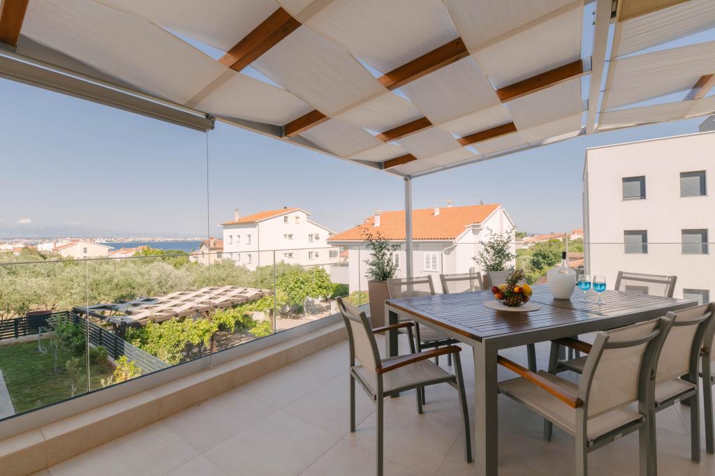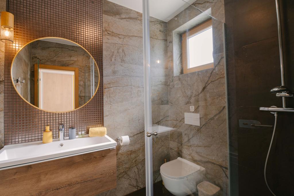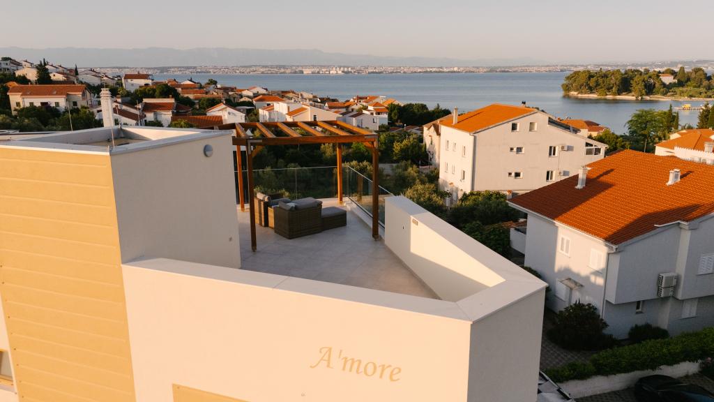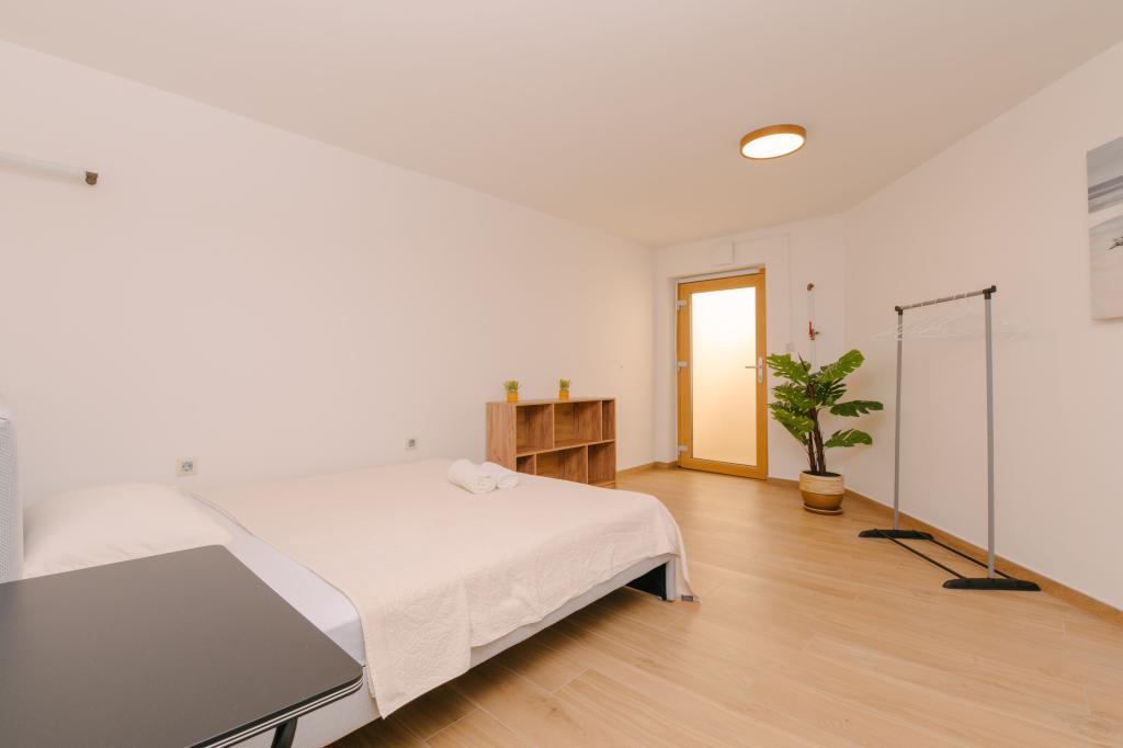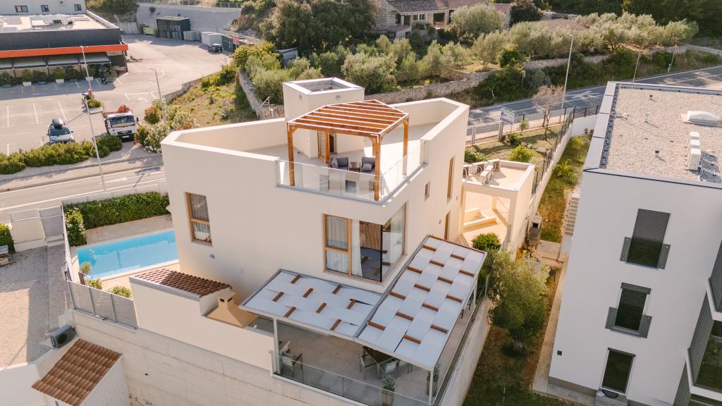 Három modern hálószoba található az emeleten, míg egy vendégszoba az alagsorban. Minden fürdőszoba a legmodernebb Grohe és Laufen szerelvényekkel, tekintélyes designer kerámialapokkal és elegáns üvegajtókkal van felszerelve. A ház hivatalosan is a Horvát Köztársaság Turisztikai Minisztériuma által minősített, amely 9, akár 10 vendég kényelmes elszállásolását teszi lehetővé. A nyitott terű nappali és étkező, valamint minden hálószoba egyedi légkondicionálóval van felszerelve, csendes üzemmóddal, amely tökéletes a nyugodt alváshoz. A modern konyha, a híres osztrák DanKüchen márkától, teljesen felszerelt a legmodernebb gépekkel, beleértve a jégkészítővel ellátott hűtőszekrényt és a hidegvíz-adagolót.