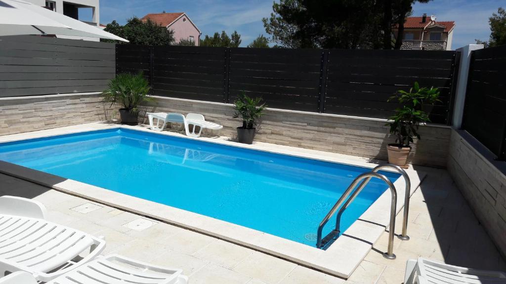 Teljesen és modern berendezésű villa, amely három különálló apartmanból áll, összesen öt szobával (két apartman két szobával és egy egy szobával), három fürdőszobával és három konyhával. Minden apartmanhoz saját konyha, fürdőszoba és fedett terasz tartozik asztallal és székekkel. Az ingatlanhoz egy hátsó udvari medence, napozóágyak, egy szabadtéri asztal székekkel és grillező tartozik. A létesítmény ideális három család vagy egy nagyobb baráti társaság számára. A tengerre és a tengerre néző medence, szabadtéri grill, gyönyörűen berendezett villák csendes környezete ideális pihentető nyaralást kínál. A létesítmény Sibenik városa, a Krka és a Kornati nemzeti park közelében található.