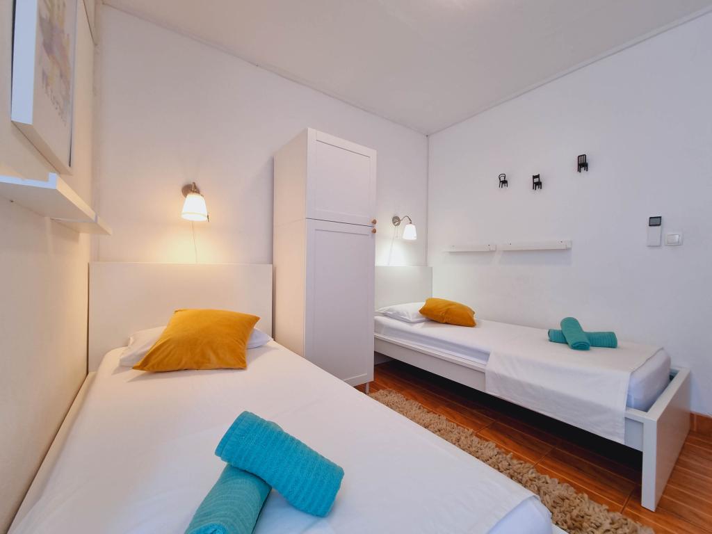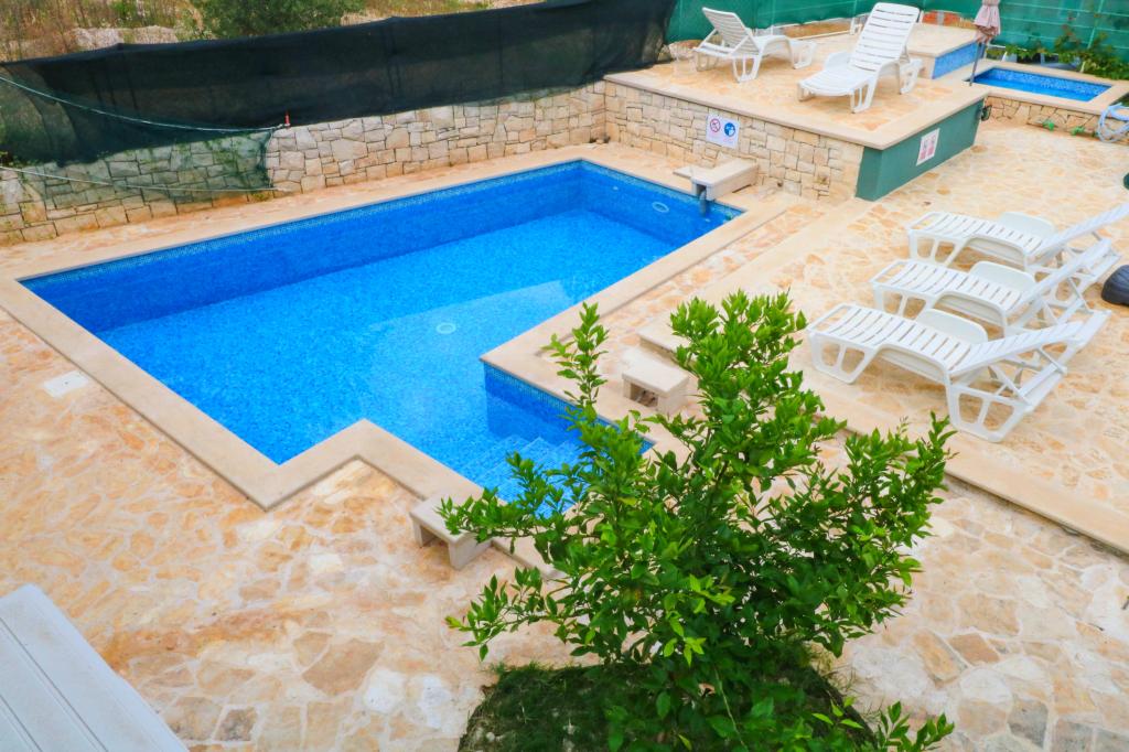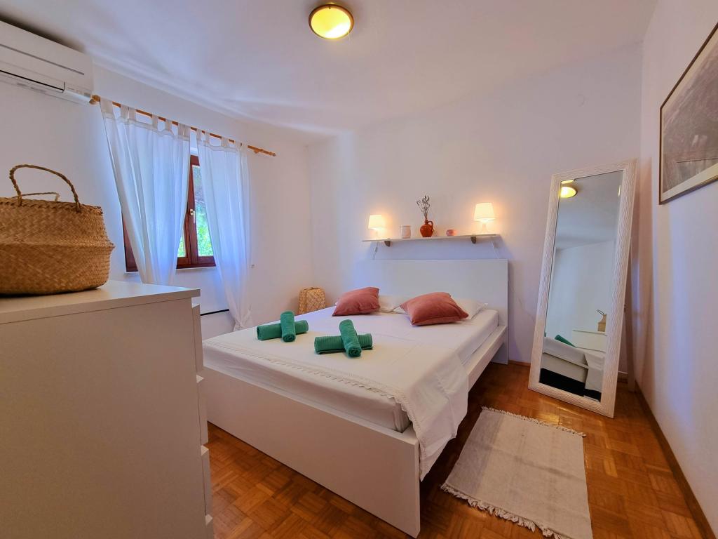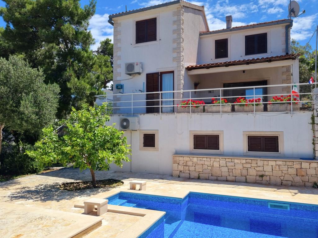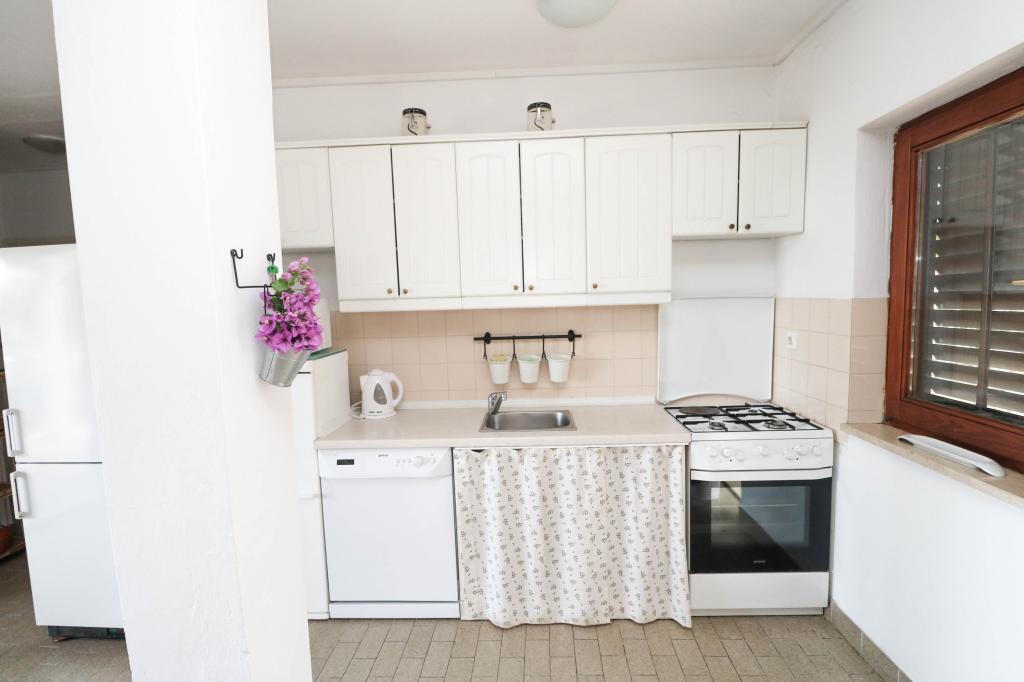 A Villa Dvornik teljes magánéletet biztosít kényelmes szálláson gyermekes családok, diákcsoportok és több generációs családi összejövetelek számára. A tengerre néző apartman mindössze 300 méterre található a tengertől és a strandtól. Lakóterület 110 m2 + 25 m2 terasz, nagy, 280 m2-es kőlappal burkolt kert, 4 szobával (8 ágyas) és két medencével. Egy nagy medence 4 db 24 m2-es, 1,5 m mélységű, felnőttek számára kialakított masszázsfúvókával, valamint egy kisebb, 3,5 m2-es, 0,5 m-es, kisgyermekeknek szánt medence. Mindkét medence 10 m2-es napkollektorokkal fűtött a medence hőmérséklete májusban és októberben 21 °C. A kültéri zuhanyzó és grill a ház körül található. A ház légkondicionált és vezeték nélküli internet-hozzáféréssel rendelkezik. A házat körülvevő telken belül három parkolóhely biztosított. Háziállatokat szívesen fogadunk.