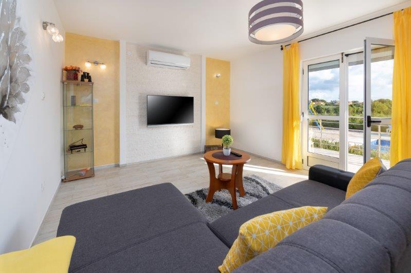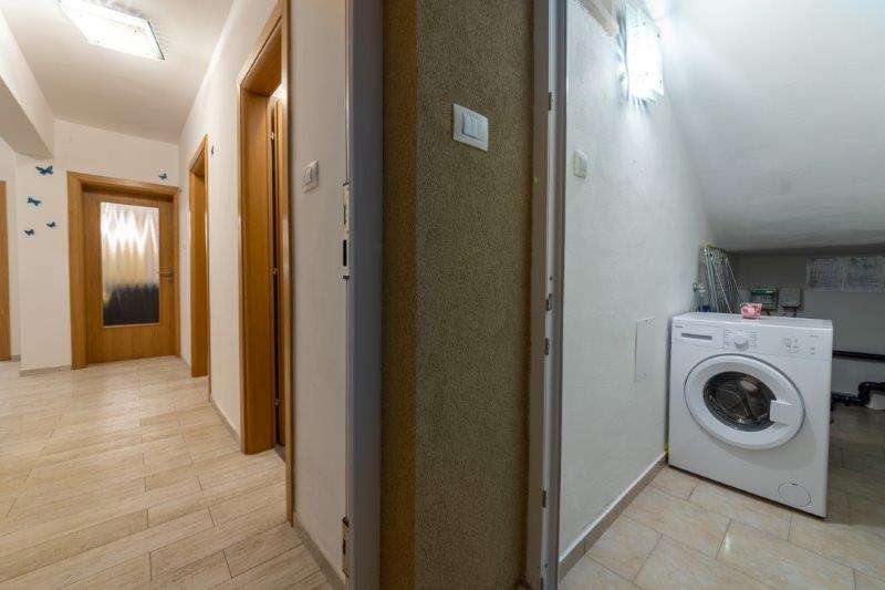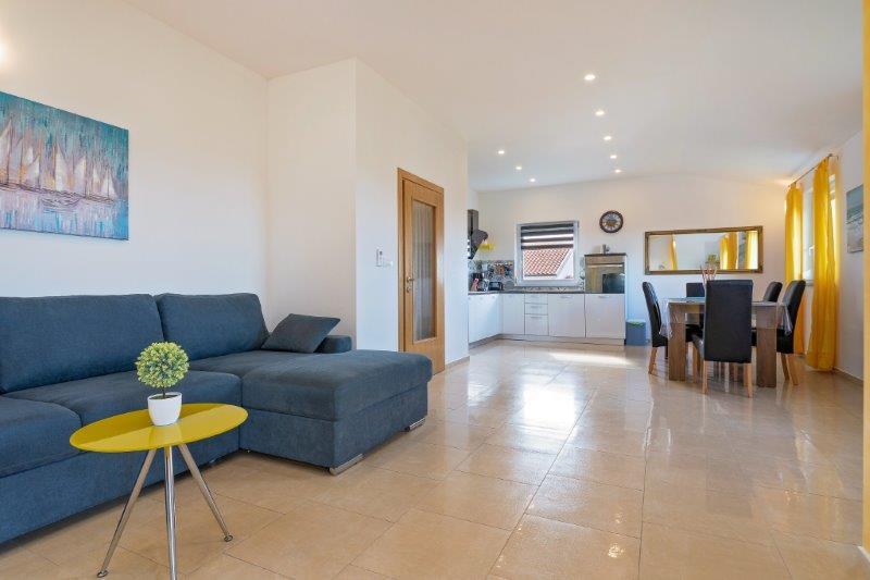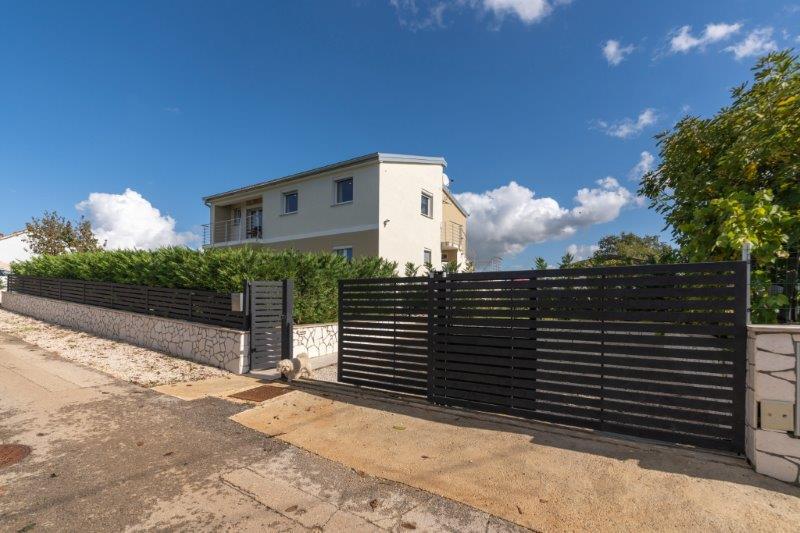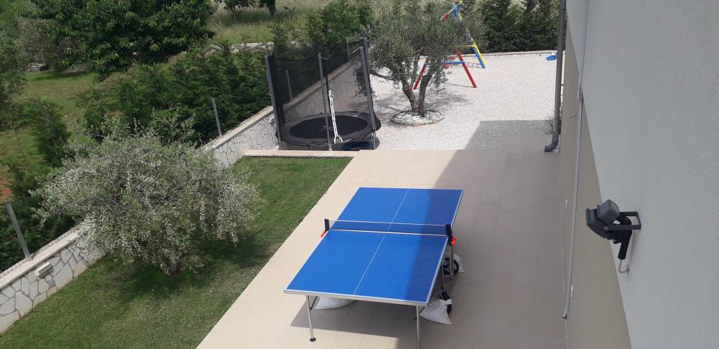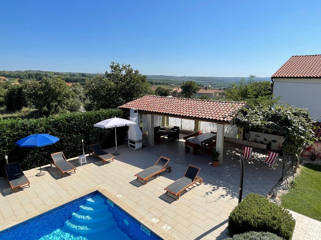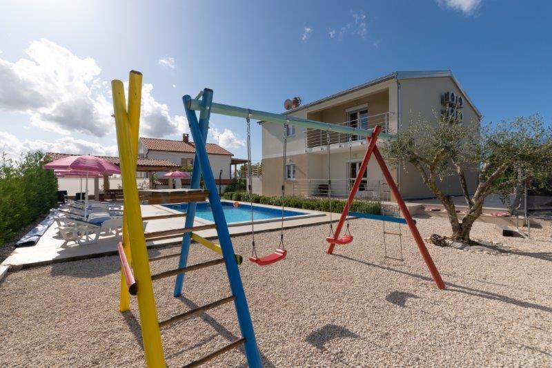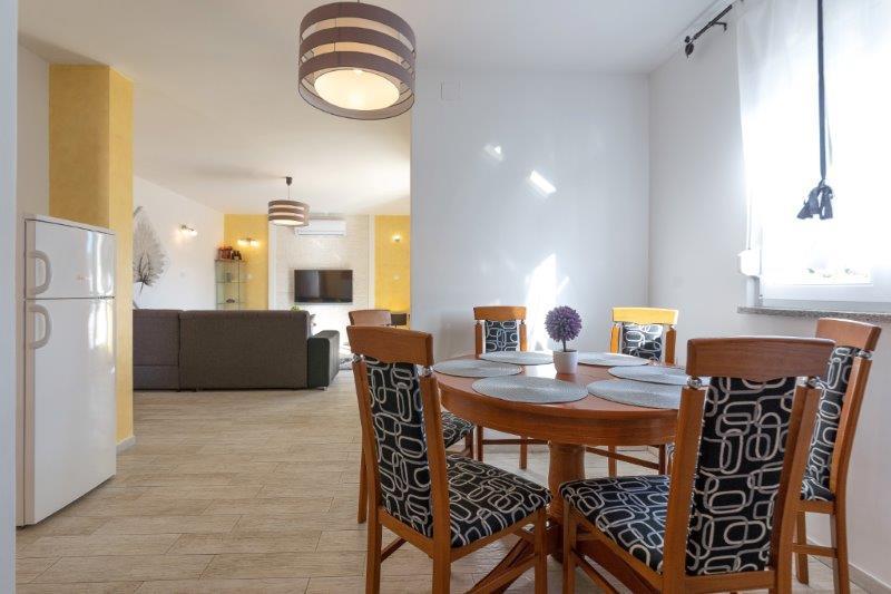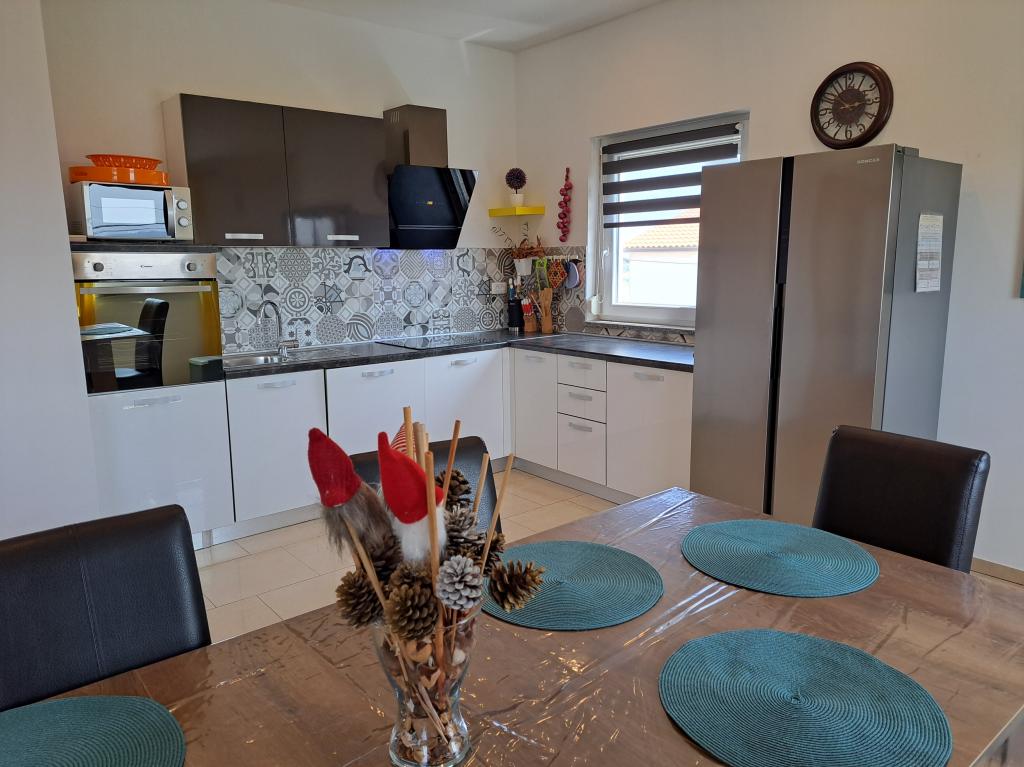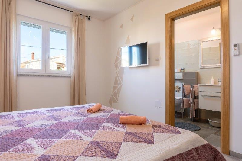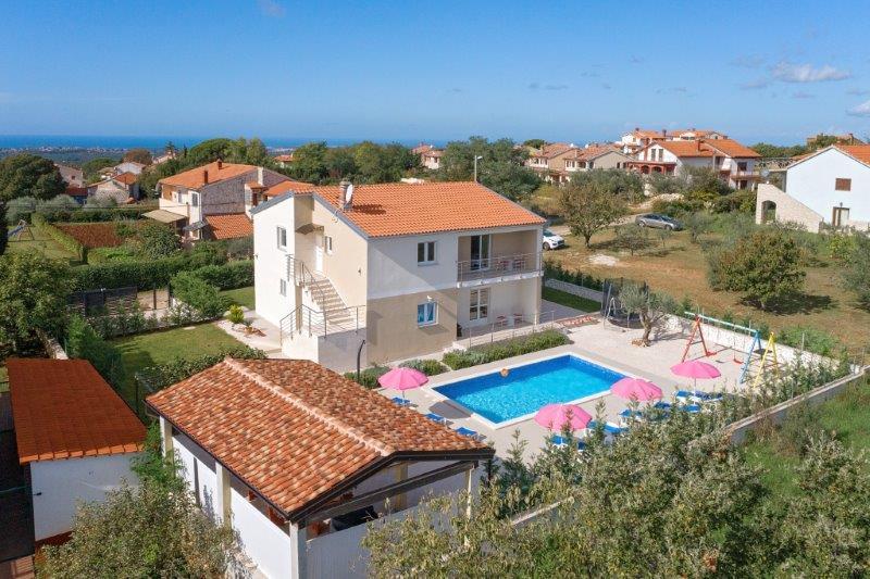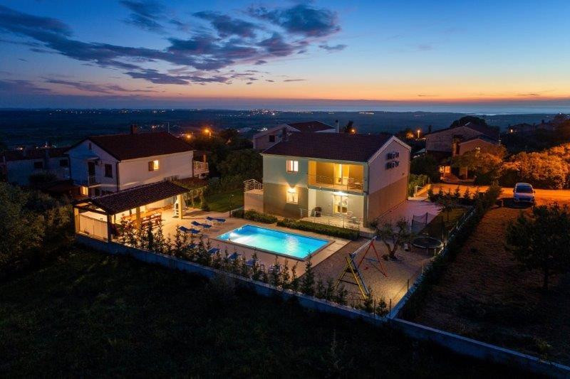 Kaštelir kisvárosban található, 10 km-re Porečtől. A ház két különálló apartmanból áll, az egyik a földszinten, a másik az emeleten, a ház egy egészben bérelhető. Minden apartman egy nappaliból, konyhából, két hálószobából áll, mindegyikhez saját fürdőszoba tartozik. Minden apartmanban 3 légkondicionáló található, egy a nappaliban és egy minden szobában. Az apartman mindennel fel van szerelve, ami a kellemes tartózkodáshoz szükséges. Kint van egy játszótér hintával, trambulinnal és asztaliteniszasztallal. Az udvar teljesen be van kerítve, így kutyáját is hozhatja, a kutyák után napi 12 euró díjat számítunk fel. Kint van még egy 8*4 m-es medence, napozóágyak, napernyők és egy nyári konyha grillezővel. Az apartman előtt 6 parkolóhely áll rendelkezésünkre, melyből 2 fedett nálunk Júliusban és augusztusban csak vasárnaptól vasárnapig lehet foglalni, a többi hónapban pedig a minimum 5 nap és az érkezési idő a hét bármely napja lehet. A ház ideális 8 fő elhelyezésére, de 10 fő elhelyezésére is alkalmas, személyenként 25 €.