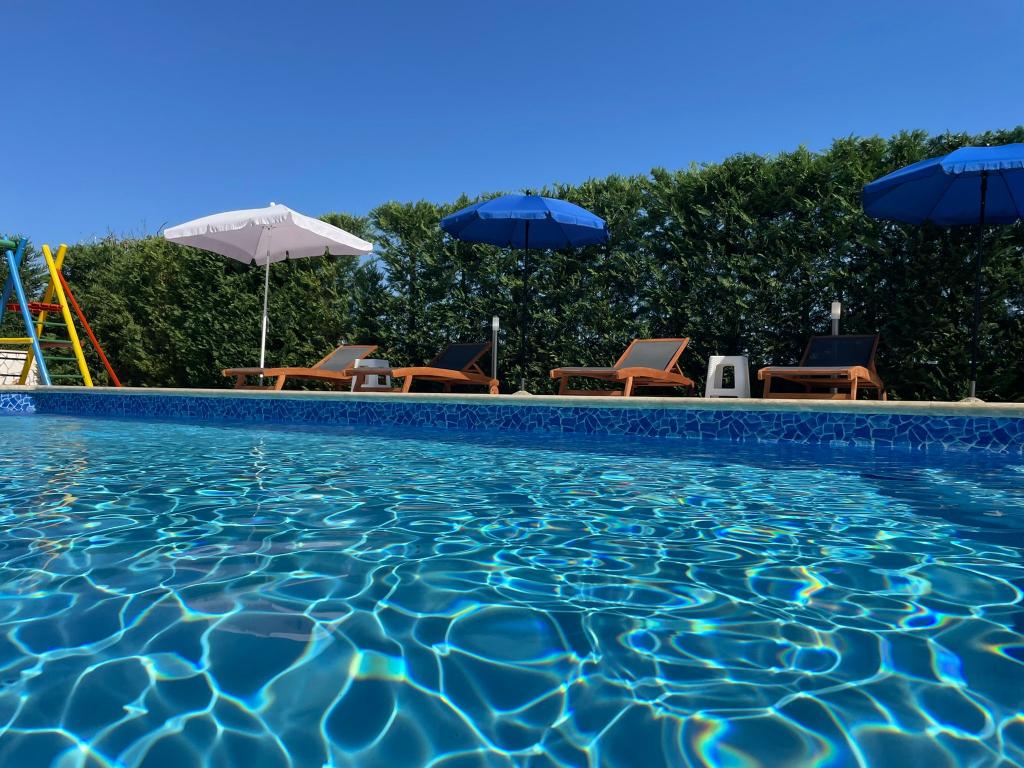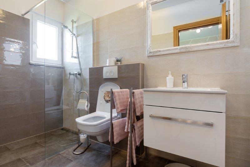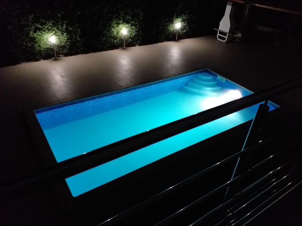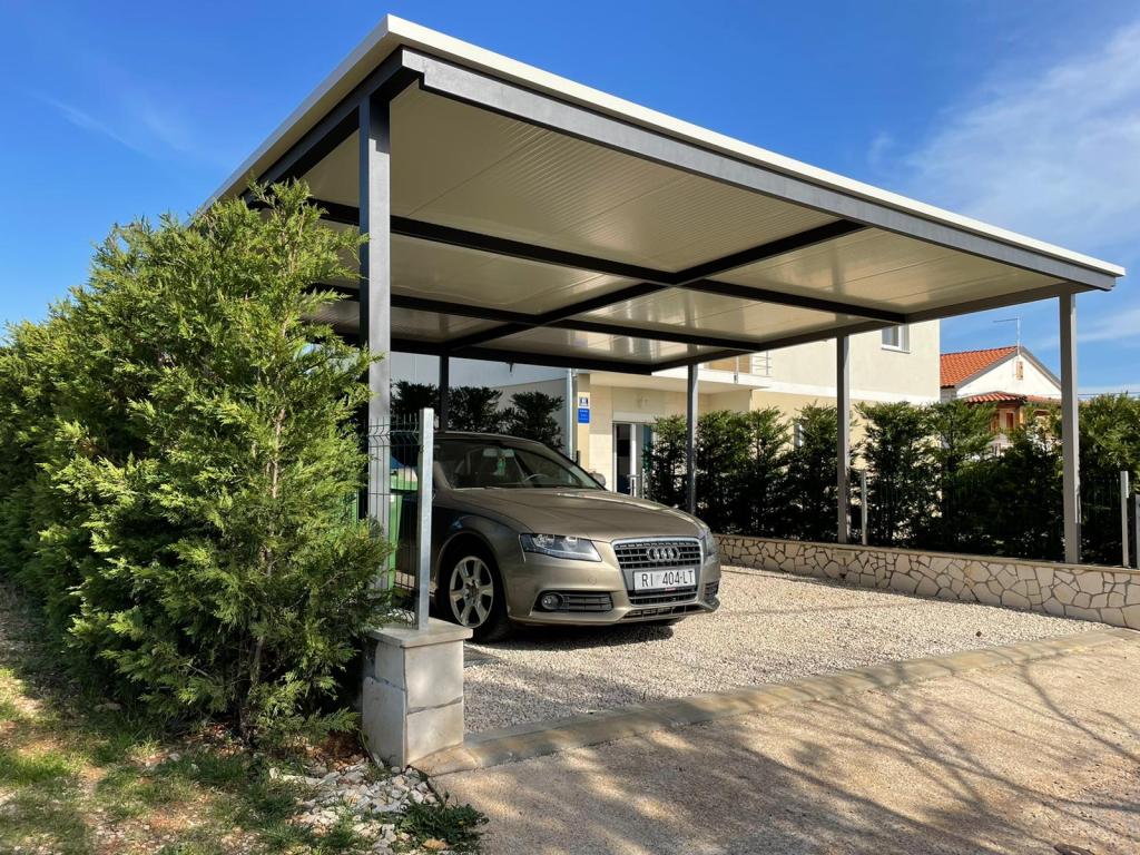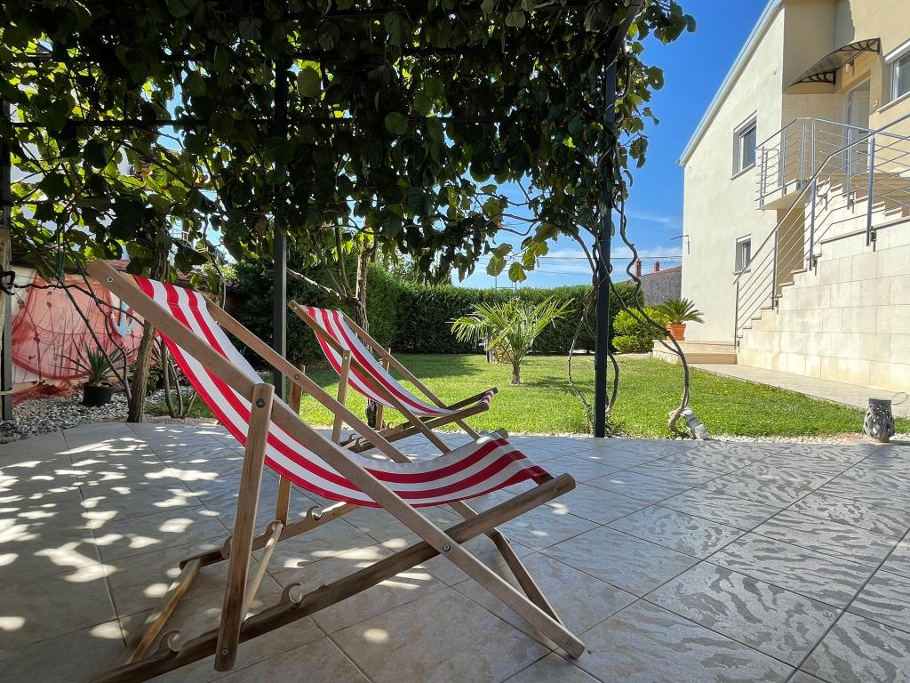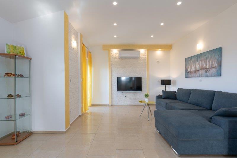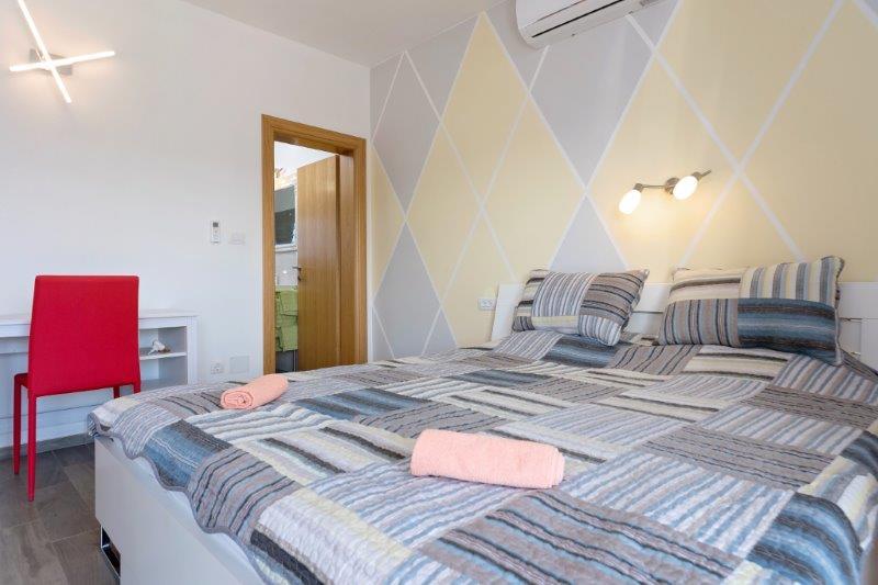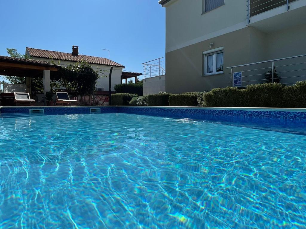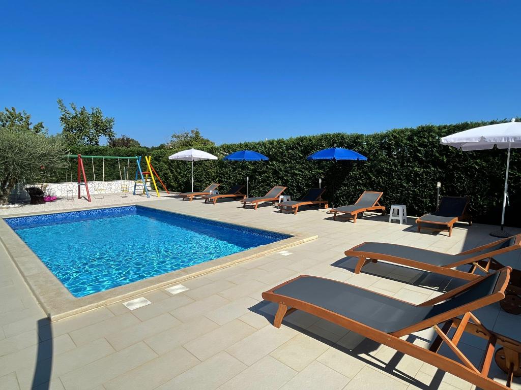 Kaštelir kisvárosban található, 10 km-re Porečtől. A ház két különálló apartmanból áll, az egyik a földszinten, a másik az emeleten, a ház egy egészben bérelhető. Minden apartman egy nappaliból, konyhából, két hálószobából áll, mindegyikhez saját fürdőszoba tartozik. Minden apartmanban 3 légkondicionáló található, egy a nappaliban és egy minden szobában. Az apartman mindennel fel van szerelve, ami a kellemes tartózkodáshoz szükséges. Kint van egy játszótér hintával, trambulinnal és asztaliteniszasztallal. Az udvar teljesen be van kerítve, így kutyáját is hozhatja, a kutyák után napi 12 euró díjat számítunk fel. Kint van még egy 8*4 m-es medence, napozóágyak, napernyők és egy nyári konyha grillezővel. Az apartman előtt 6 parkolóhely áll rendelkezésünkre, melyből 2 fedett nálunk Júliusban és augusztusban csak vasárnaptól vasárnapig lehet foglalni, a többi hónapban pedig a minimum 5 nap és az érkezési idő a hét bármely napja lehet. A ház ideális 8 fő elhelyezésére, de 10 fő elhelyezésére is alkalmas, személyenként 25 €.