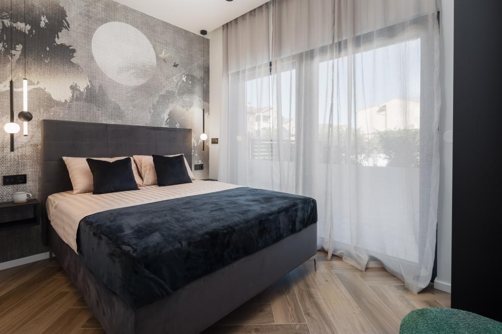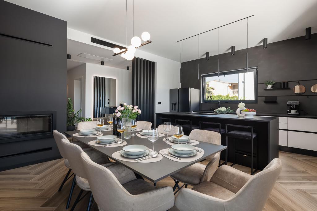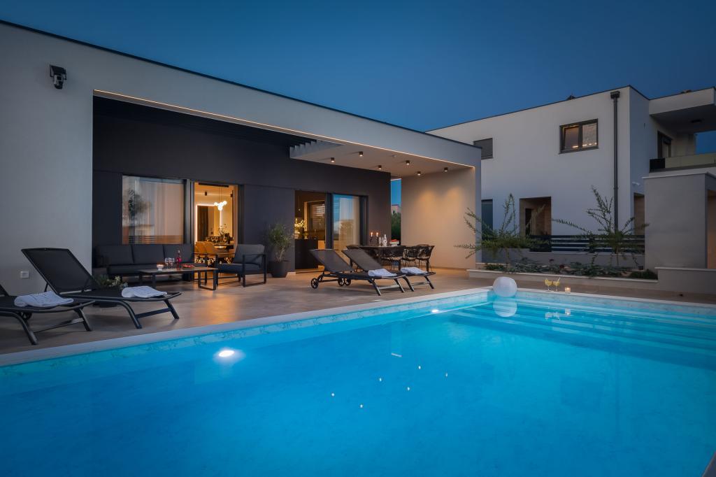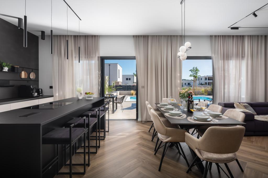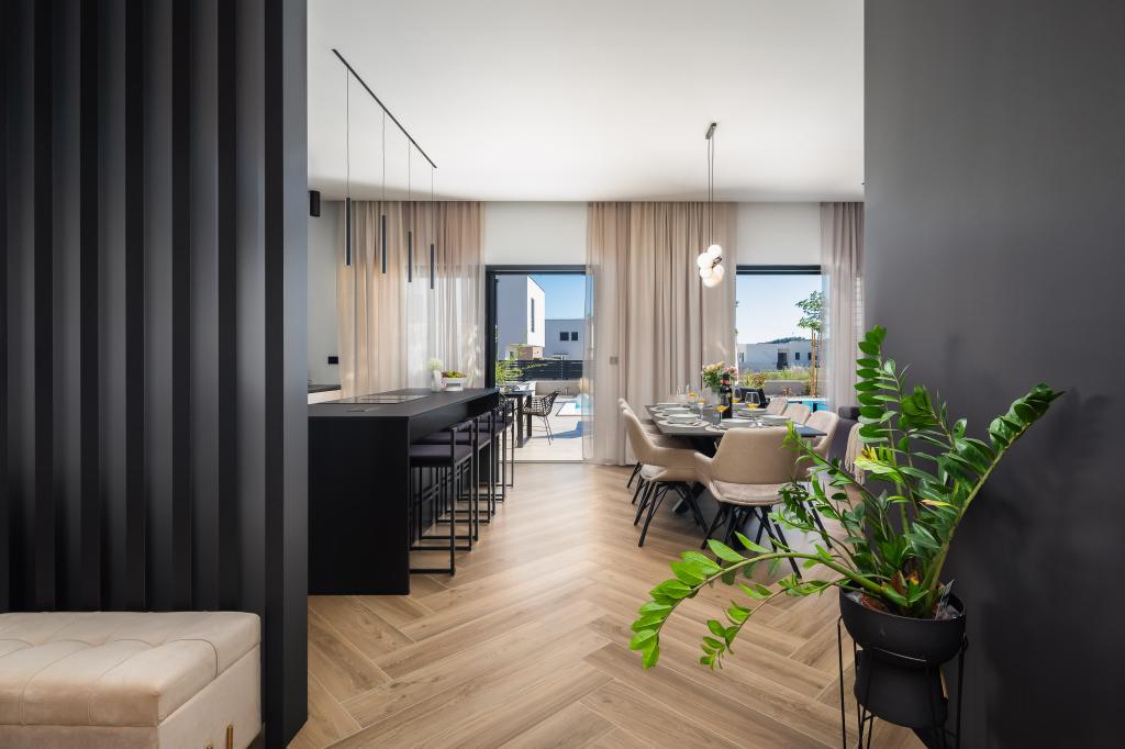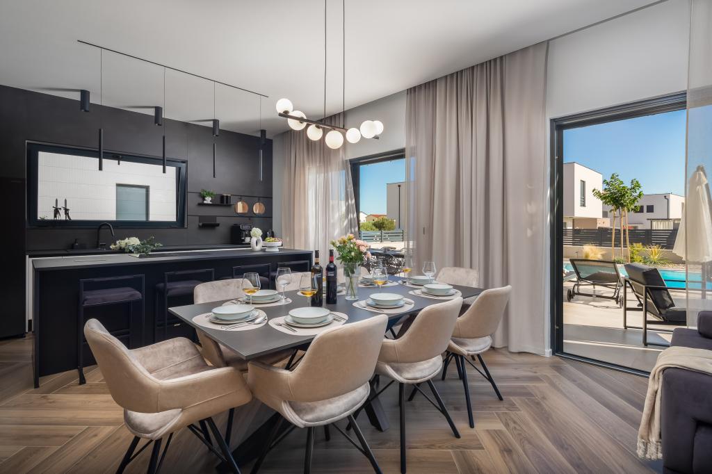 Gyönyörűen berendezett modern villa Vodicében, egy csendes faluban, ideális a nyaraláshoz. A ház egyszintes, nyitott terű, nagy konyhával és tágas nappalival, kényelmes kanapéval. A villában 3 hálószoba található, saját fürdőszobával. A tágas teraszon a medence mellett pihenhet, és élvezheti a grillen készült ételeket. A villa kerítéssel van körülvéve.
