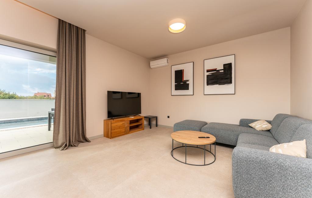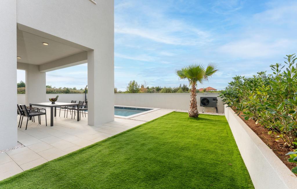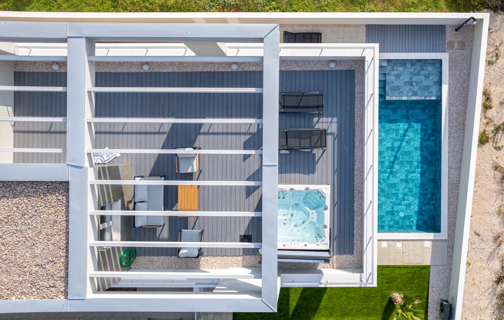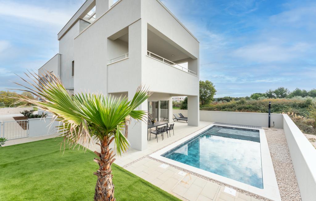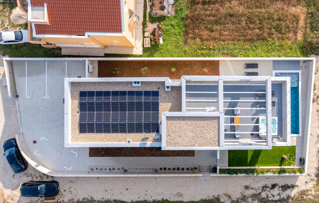 A körülbelül 270 m²-es ház Zatonban található, Zadartól 12 km-re északnyugatra. Az épület új, 2025 júniusában készült el. A bekerített udvarban 4 parkolóhely, 2 elektromos autó töltőállomás, egy 30 m²-es fűtött medence és egy nagy terasz található, ahol délutánig élvezheti az árnyékot. A házban két azonos elrendezésű apartman található, mindegyikben nappali, teljesen felszerelt konyha, 3 hálószoba, 2 fürdőszoba és egy további WC található. Minden szoba légkondicionált, és mindegyik okos TV-vel felszerelt. A ház 12 fő befogadására alkalmas. A ház minden emeletén a gyerekszobában található egy 5. számú fürdőszoba. A ház tetején tengerre néző terasz, egy további konyhasarok, kerti bútorok és masszázskád található a nappali és esti kikapcsolódáshoz. Családdal és/vagy barátokkal együtt, de szükség esetén külön-külön is (mindegyik a saját apartmanjában) élvezheti a létesítményt. Napközben biztosan élvezni fogja a medencét és az alsó terasz nyújtotta árnyékot, este pedig a tetőteraszon pihenhet.